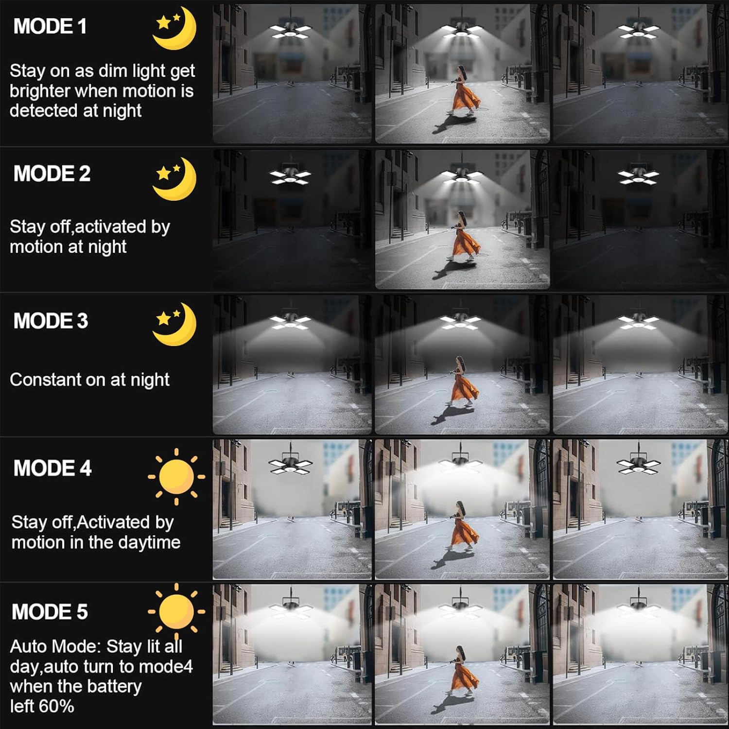 (Mode 4 and Mode 5 of the solar motion sensor outdoor lights are functional during daytime and nighttime)