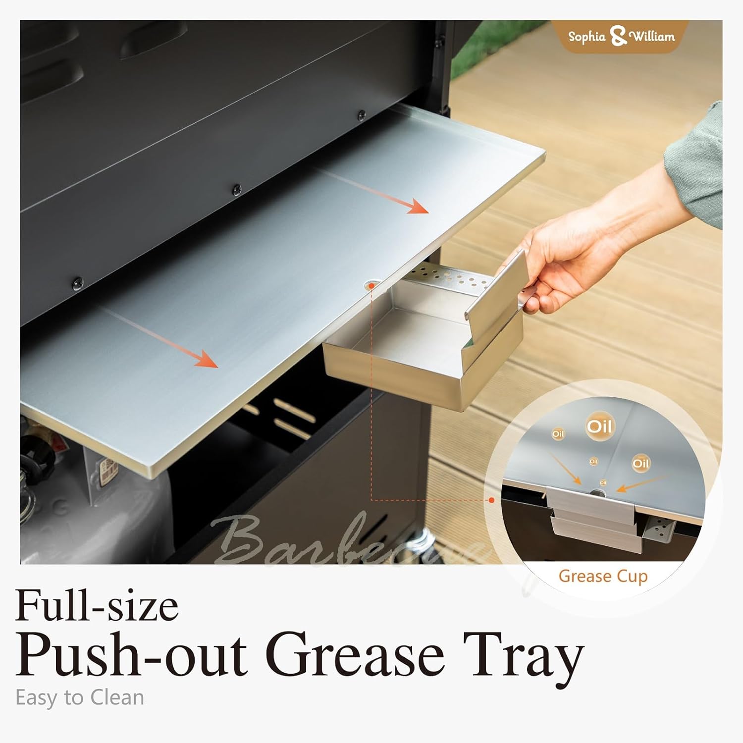 【Stainless Steel Burner】4 Stainless steel burners and side burner for ideal heat control with battery operated electronic ignite system, quick start up with the push and turn of a control knob. Gas grills provide a total 42,000 BTU of cooking power including 32,000BTU main cooking space and 10,000 BUT side burner
