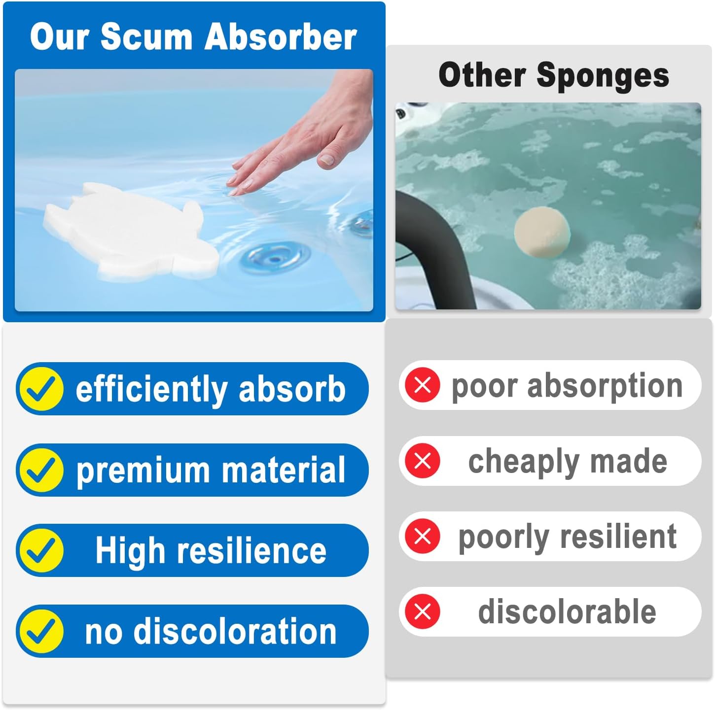 Hot tub scum absorber sponge prevents scum from accumulating on the water surface, ensuring that your pool or hot tub remains crystal clear. It also helps prevent cloudy water and clogged filters, prolonging the life of your equipment.