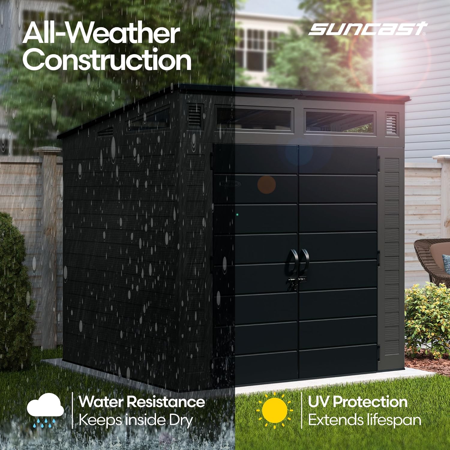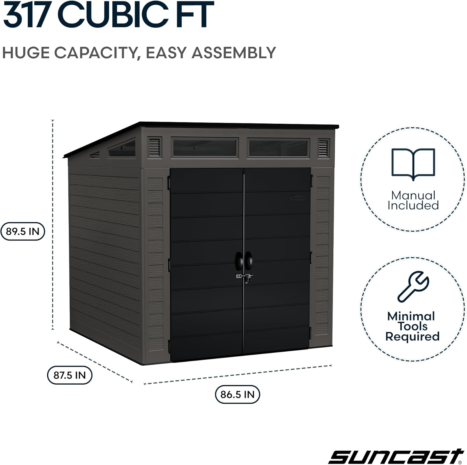 Upgrade your space with the Suncast Modern Shed, a durable and stylish shed for outdoor storage that’s waterproof and built to last. Designed for versatility, this vertical outdoor storage shed is perfect for organizing bikes, tools, patio gear, and trash bins, all in a sleek, modern footprint. Crafted from premium multi-wall resin, it functions as a high-performance waterproof storage shed that resists rain, snow, and UV damage. Whether you’re seeking a bicycle storage shed or general-purpose backyard storage with floor, this shed is engineered to keep your gear safe and dry year-round. The integrated shed floor base supports heavy loads, making it ideal for gardening supplies, power tools, and more. With a steel-reinforced frame, pad-lockable double doors, and a weather-sealed structure, this outdoor storage unit offers serious protection with zero maintenance. Natural light and airflow are maximized through built-in windows and the IllumiVent® ventilation system, perfect for a shed with windows and floor that stays usable in all seasons. From bicycle sheds to vertical sheds for outdoor use, this is one of the most HOA-friendly patio sheds outdoor waterproof buyers can find. Whether you’re upgrading cluttered corners or adding structure to your landscape, Suncast delivers unmatched style and strength with this outdoor storage shed waterproof solution.