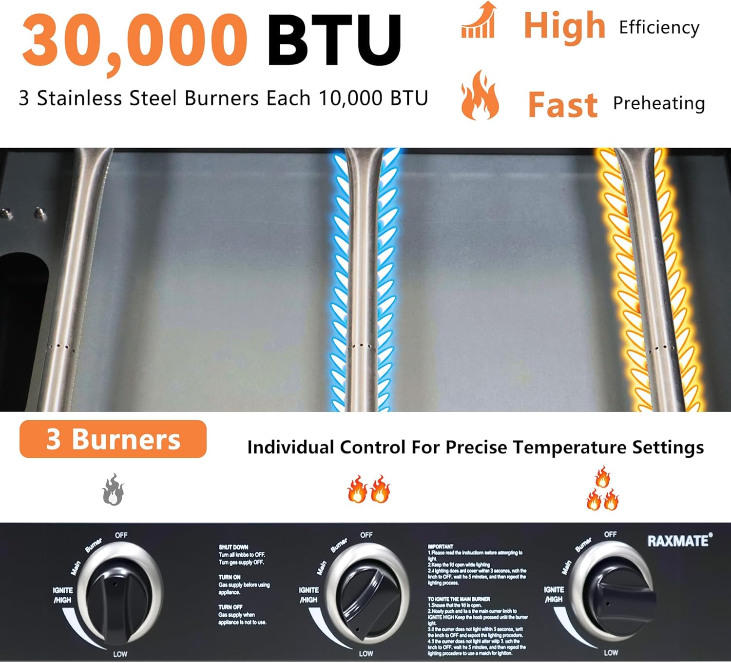 【Powerful 3-Burner Cooking System】 This propane flat top griddle eatures three independently controlled burners delivering a total of 30,000 BTUs—ideal for versatile cooking from pancakes to steaks. This 22-inch propane griddle ensures even heat distribution for backyard BBQs, tailgating, and camping.