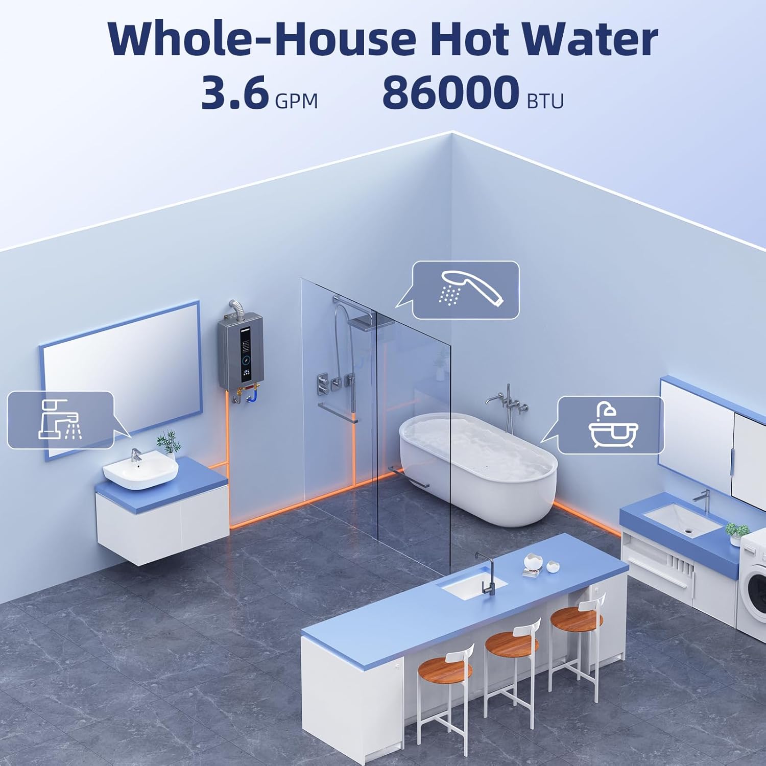 【Reliable Hot Water on Demand】 With 86,000 BTU power, this on demand water heater delivers up to 3.6 GPM instant hot water. You can comfortably run a shower, kitchen faucet, and bathroom sink simultaneously—all without any noticeable temperature drop.
