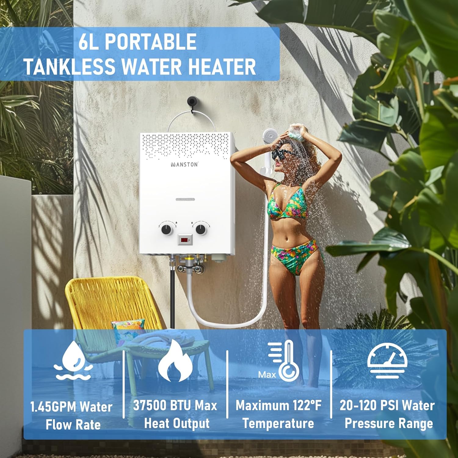 Instant Hot Water – Our tankless water heater is high-efficiency with a maximun output of 37,500 BTU/hr, providing 1.45 GPM of steaming hot water on demand with a maximum adjustable temperature of 75°C (167°F). Enjoy near-instant hot water in just 2 seconds—This propane water heater outdoor is ideal for showers, dishwashing, and quick cleanup