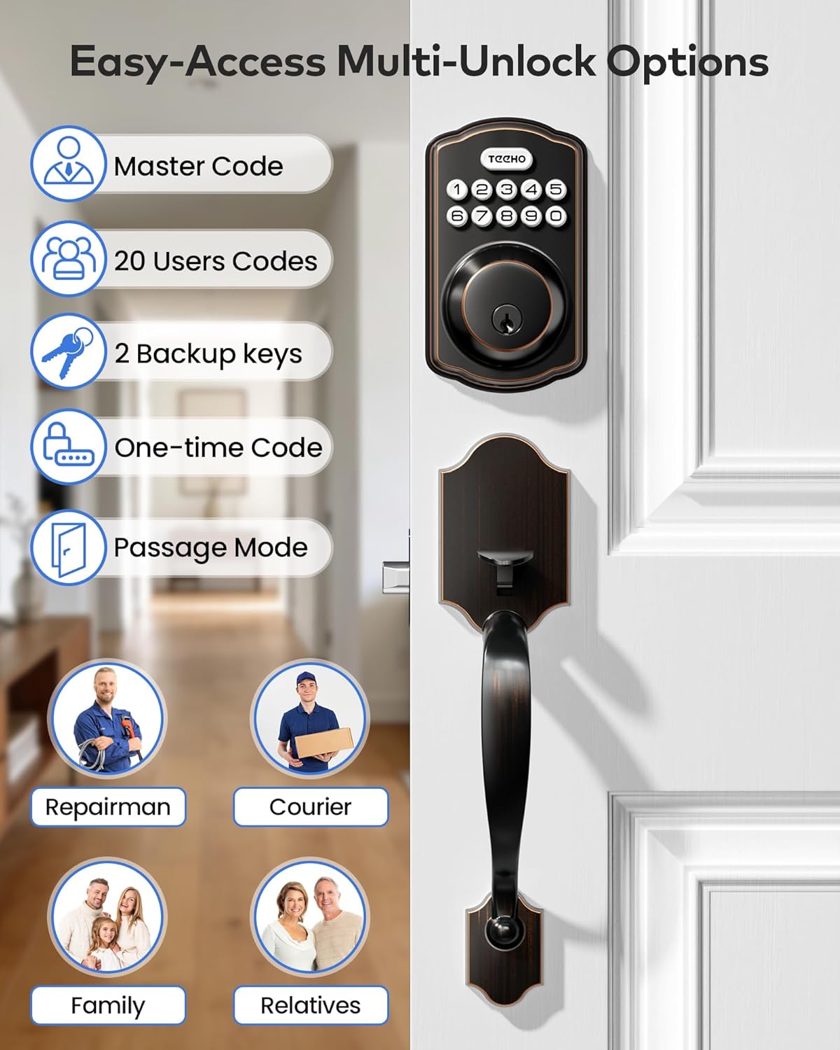 4 Ways to Unlock: Teeho keypad door lock with handle offers 4 ways to unlock—20 user codes, 2 backup keys, one-time codes, and passage mode. One-time passwords are single-use and automatically delete after use, providing secure, temporary access for guests or service personnel