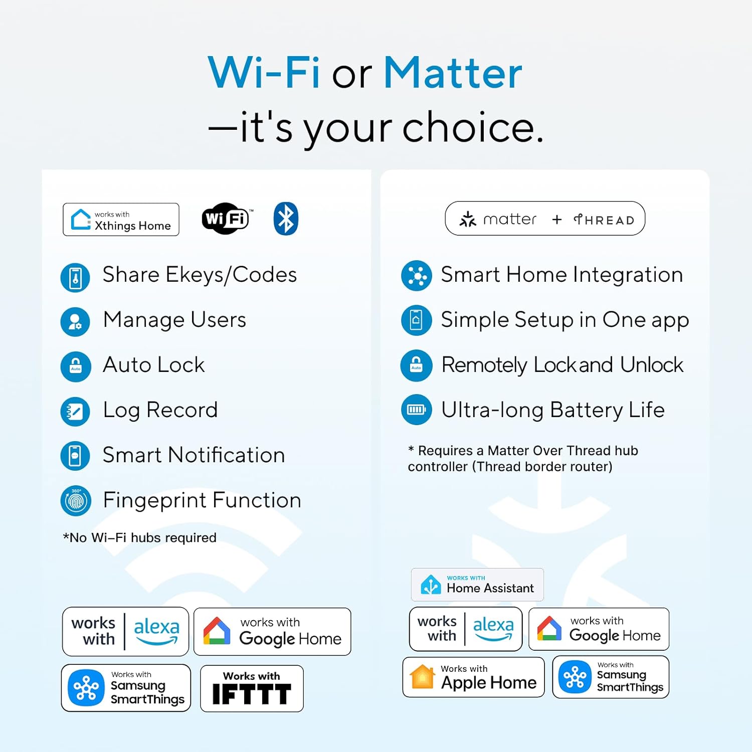 【Effortless Matter Integration】: Our matter smart lock seamlessly integrates with all matter-enabled ecosystems. Voice control with Siri, Alexa and Google Assistant. It can be used to automate your smart home by pairing multiple matter-enabled devices through the One App. No more compatibility headaches