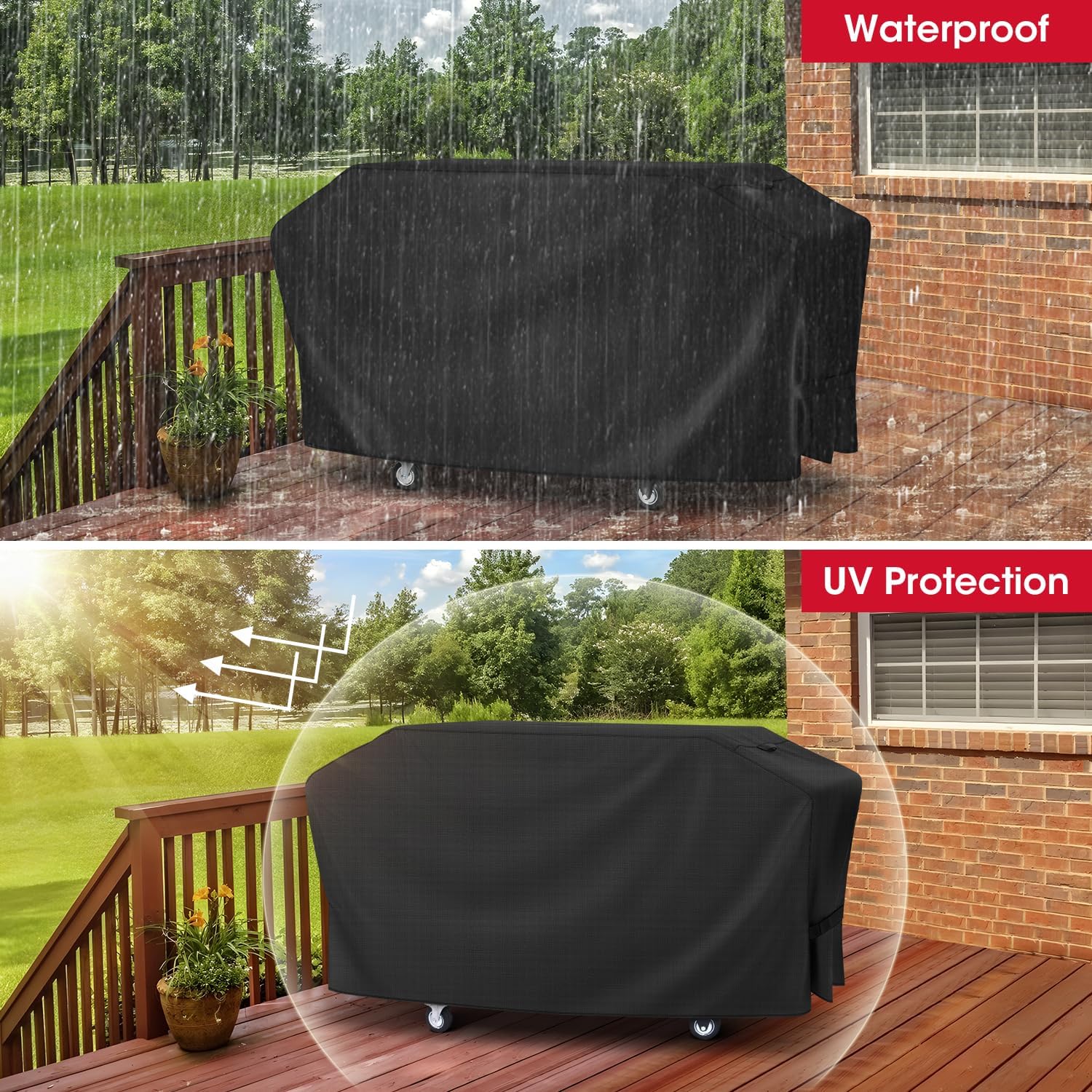 Waterproof: Unicook is committed to continually improving our grill covers. In 2024, we launched a new line of grill covers – made of UV resistant waterproof textured vinyl shells with heavy-duty fabric liners, enhance waterproof protection, work as a barrier for sun, rain, snow, dirt and debris. Keep your grill dry and clean all year round