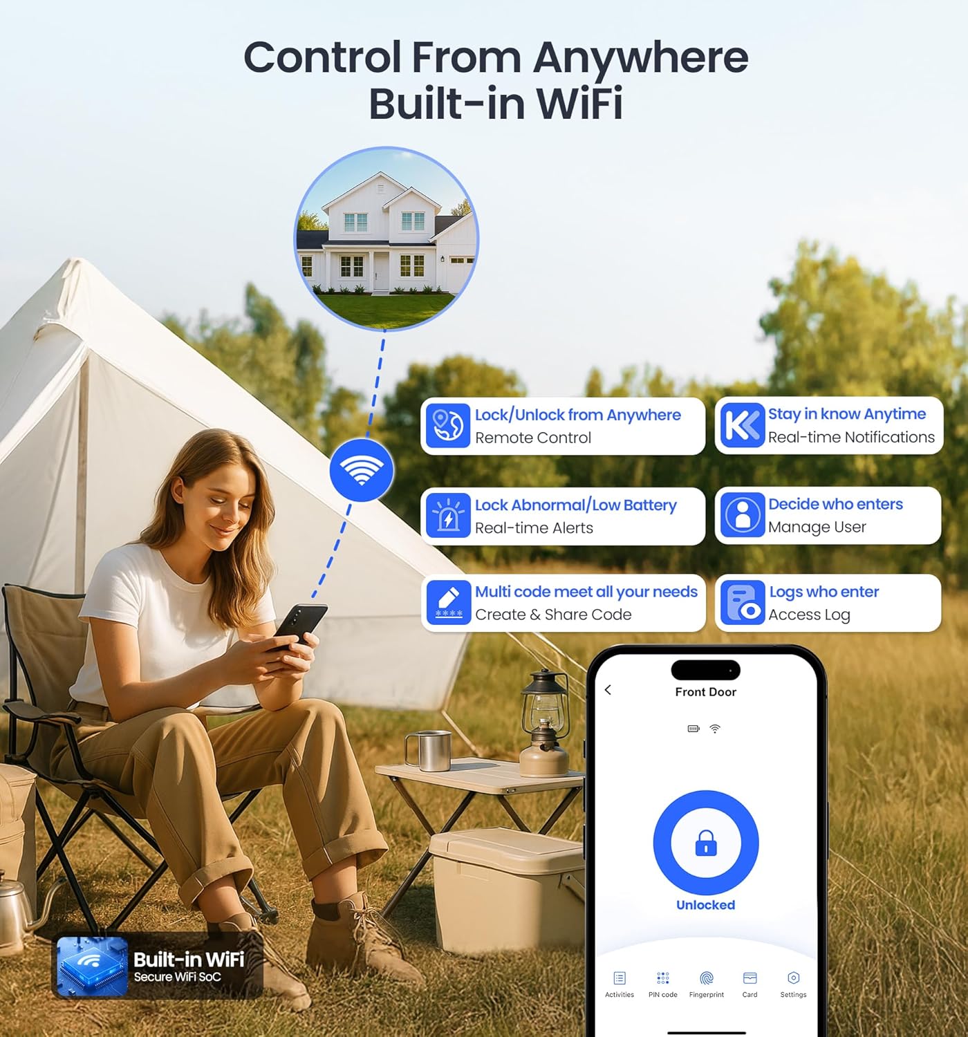 Remote APP Control from Anywhere: With this smart lock, you can Remote lock/unlock, Check status,Review complete Access log, APP Battery Status Check, Receive instant Notifications & Alerts,Manage access, create,share and delete fingerprints or passwords ,even in Travel, Work, camping,total peace of mind is in your palm