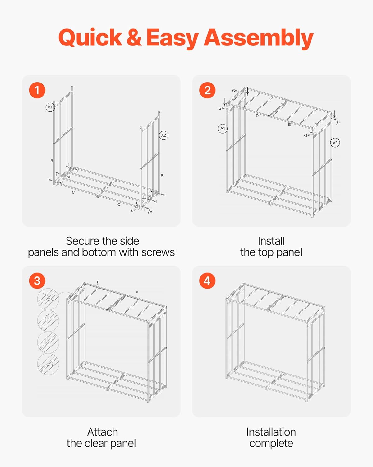 This firewood rack features polycarbonate panels that block sunlight and rain while allowing airflow. The sturdy aluminum frame ensures long-term support, and the black powder-coated finish resists moisture and corrosion. Keeps firewood organized, dry, and ready for use!