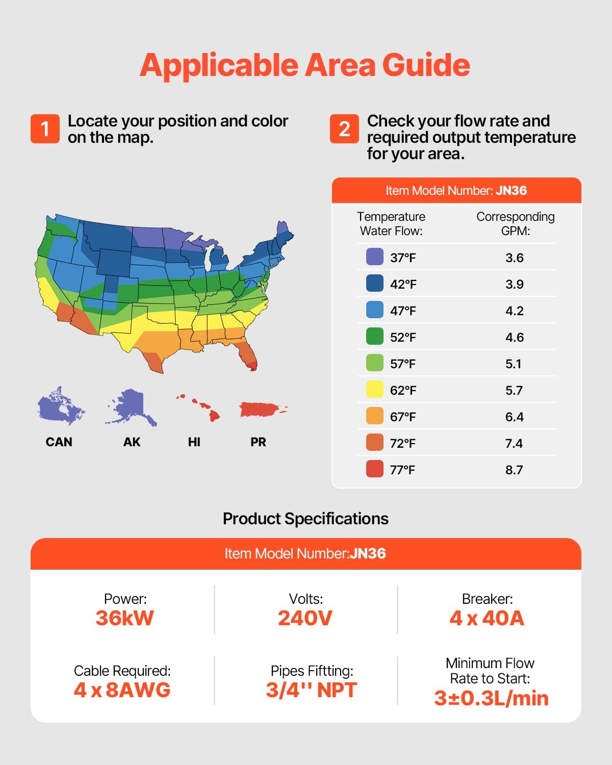 Die-Cast Aluminum Heating: The water and electricity are separated, with no water tank, avoiding the buildup of scale and reducing the risk of electric leakage. The 36kW heating system can provide water at 30-60°C / 86-140°F within seconds. Before purchasing, please carefully review the product details (voltage, power, additional accessories and parts required, installation information, etc.)