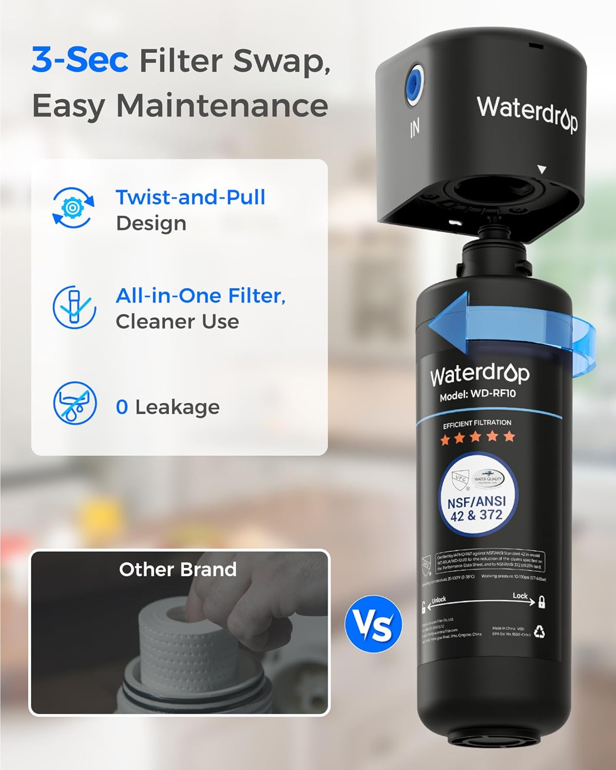 Innovative Multistage Filtration: The Waterdrop Under Sink Water Filtration System uses innovative multistage filtration. And under sink water filter with faucet can effectively reduce PFAS, PFOA/PFOS, chlorine, heavy metals, chemical iṁpurity, sediment and other large particles.[2] Use activated carbon block and other advanced filter media ensure efficient and safe filtration. Enjoy healthy and pure water straight from your water filter sink faucet – no need to buy bottled water anymore!