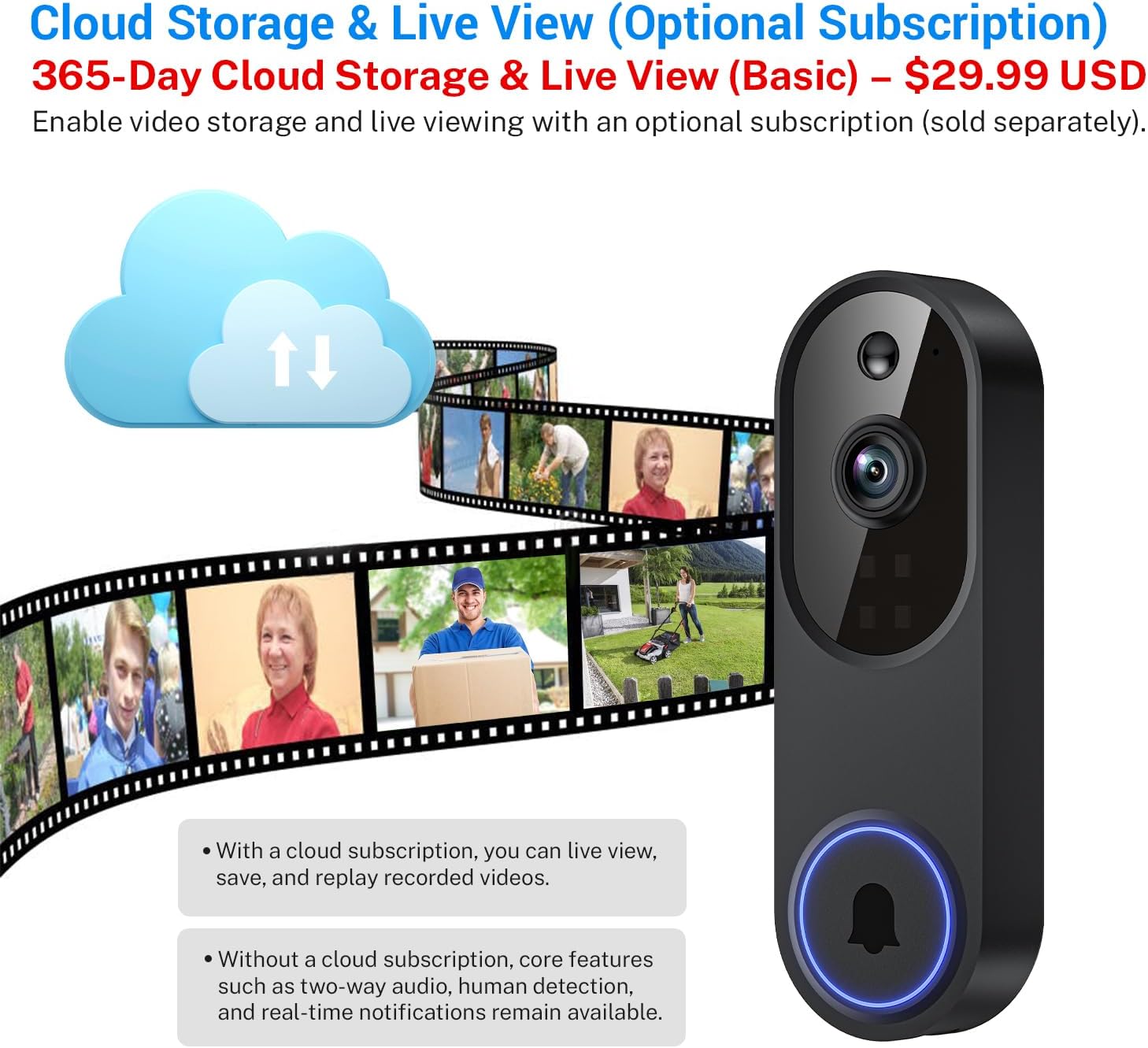Note: Cloud storage subscription is not mandatory. With a cloud subscription, you can live view, save, and replay recorded videos. Without a cloud subscription, core features such as two-way audio, human detection, and real-time notifications remain available.