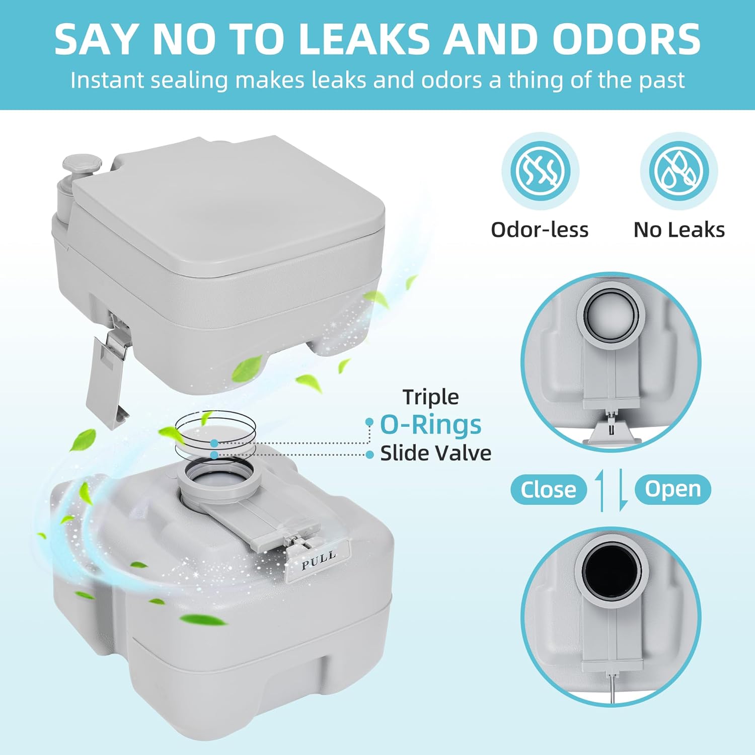 Odor-Blocking Portable Toilet: Designed with an instant-sealing slide valve, our camping toilet prevents leaks and unwanted odors. The generously-sized emptying spout lets you pour out waste easily and completely