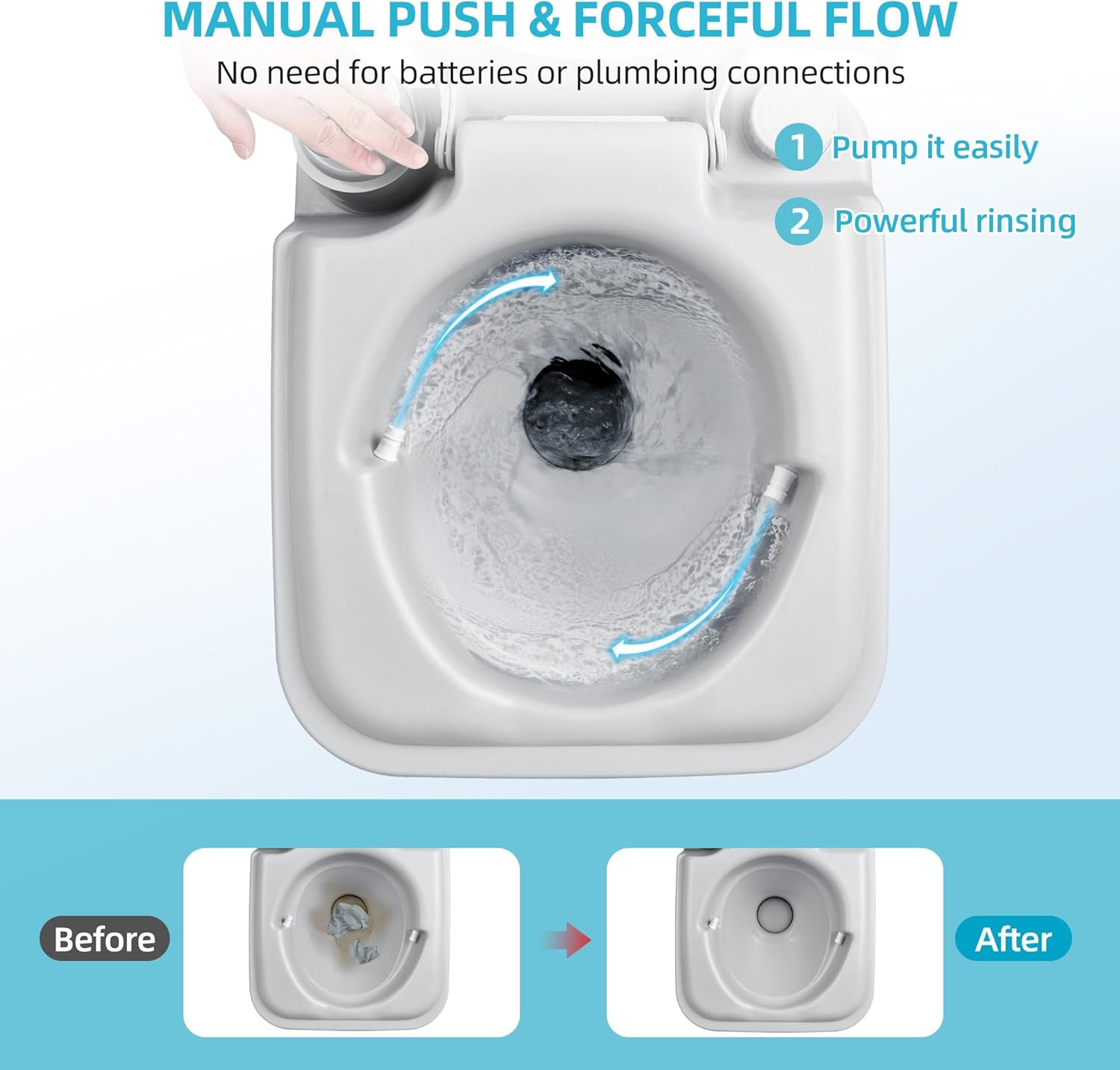 Efficient Double-Flush Portable Toilet: Our portable toilet offers a double flush with an integrated pump, ensuring powerful cleaning with no need for batteries or plumbing. A simple, efficient solution for any on-the-go situation