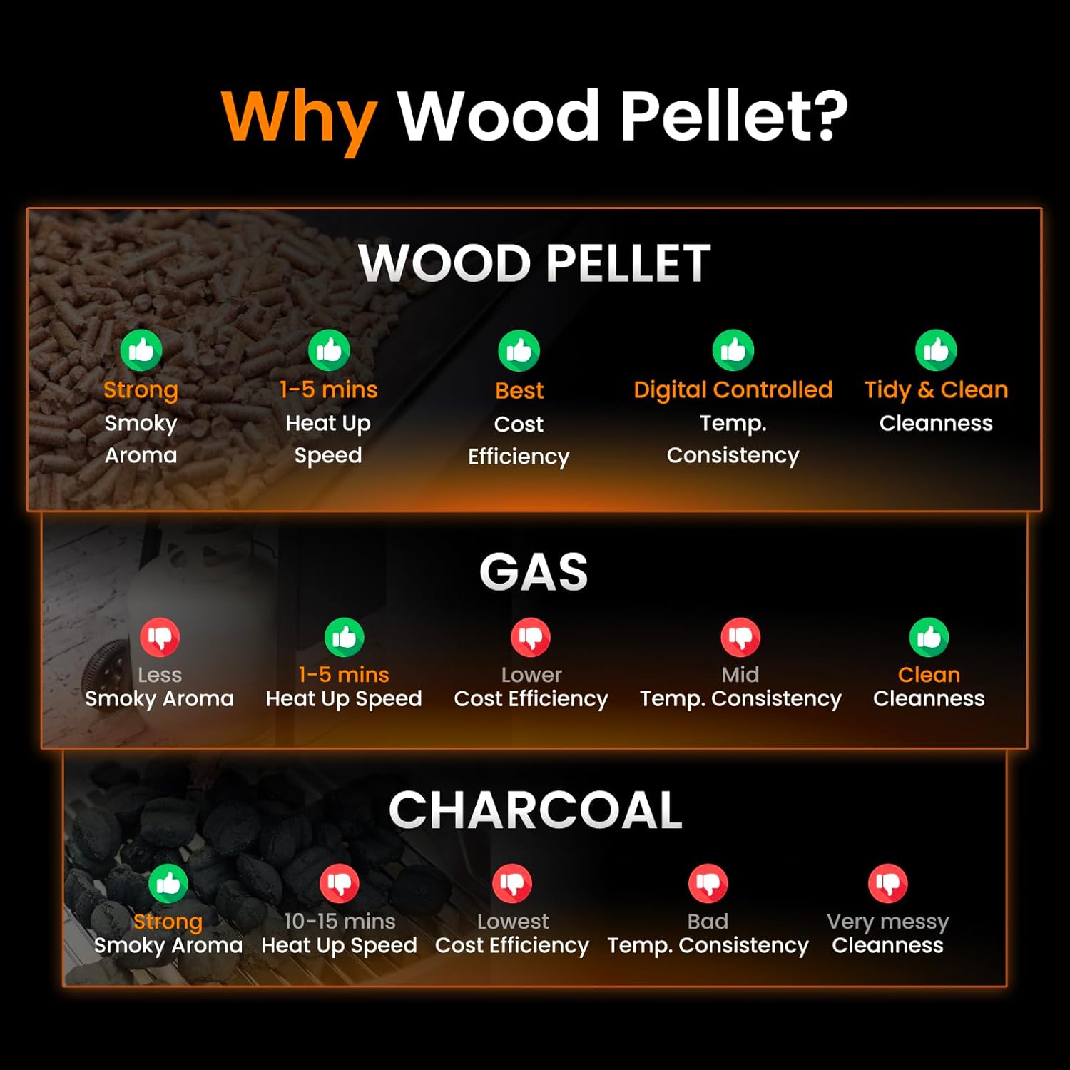 REAL-TIME TEMPERATURE MONITORING – Monitor internal temperatures effortlessly with LCD display and dual meat probes. A viewing window allows pellet checks without lifting the lid, giving you total cooking command